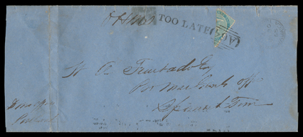 492 c SG 1d ImageS.G. #1d, 1d Pale blue, bisected, the lower left diagonal half tied across the bisect to cover to Spanish Town by "A64" obliterator, matching partial "Port-Antonio/Ja 28, 68" datestamp on reverse, manuscript "OHMS" and straightline "TOO LATE" handstamp (Foster Ty. TL3), Kingston backstamp and partial Spanish Town arrival postmark, legal-sized cover with small tears at top, one tape repaired, and slightly reduced and refolded at left, fine and rare bisect usage (Scott #1a; $825.00). (Image) £650