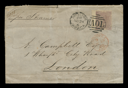 493 EDU SG 5 ImageS.G. #5, 1860 6d Dull lilac, left wing margin single tied to folded letter to London by bold strike of "Kingston/Jamaica/No 24, 6" with "AO1" Ty. Z2 duplex postmark, red "London. E.C./Paid/De 18, 60" arrival postmark repeated on reverse, several edge tears, otherwise very fine; the earliest recorded date of usage of any Jamaica stamp with pineapple watermark (Scott #5).The pineapple watermarked adhesives were issued at the Kingston Post Office on the 23rd November, 1860. All mail for the British packet would have been cancelled, accounted for and bagged on the 24th. Therefore, the only chance for an earlier cover would be a first day cover to a post town, which would have an extremely limited survival rate. (Image) Est. $4,000-5,000