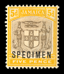 496 S SG #33-36s ImageS.G. #33-36s, 1903-04 ½d-5d Arms, overprinted "SPECIMEN" cplt., four sets, o.g., some h.r., fine-very fine (Scott #33-36s). (Image) Est. $100-150