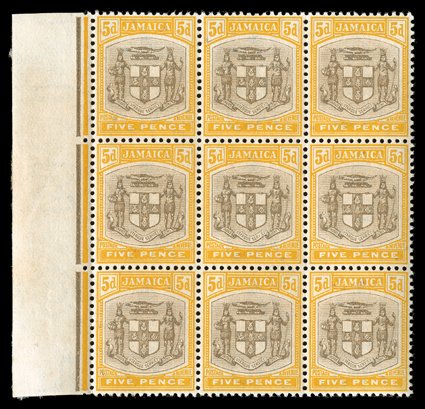497 nhbl SG 36a ImageS.G. #36a, 1904 5d Grey and yellow, "SER. ET" for "SERVIET" variety, the center stamp in a left sheet-margin mint block of nine, near perfect centering and uncommonly fresh, crisp and intact, slightly toned o.g., never hinged, extremely fine; an uncharacteristically choice example of this scarce variety; cataloged as hinged singles (Scott #36a; $990.00+). (Image) £920+