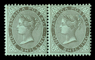 499 og SG 54a ImageS.G. #54a, 1910 1/- Black on green chalk surfaced paper, "$" for "S" in "SHILLING", the right stamp in a horizontal pair, vivid rich color on fresh paper, o.g., relatively lightly hinged, fine and scarce; this variety only occurs once in a sheet of 240 stamps on the second stamp in the second row of the upper left pane and only 170 sheets were issued (Scott #43 var.). (Image) £957