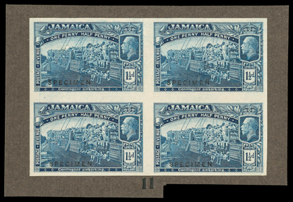 501 TCbl SG 80TC ImageS.G. #80TC, 1919 1½d Trial color proof in deep blue, overprinted "SPECIMEN" block of four mounted on stiff dark brown card and numbered "11", extremely fine; ex-De La Rue Archives (Scott #77TC). (Image) Est. $300-400