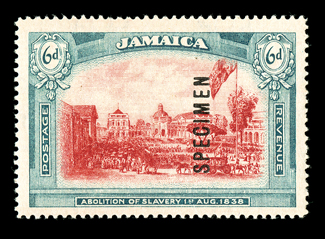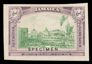 503 TC   Image1921 6d Abolition of Slavery, trial color proof in yellow-green and violet, overprinted "SPECIMEN", large margins, pinhole, otherwise extremely fine; ex-Cameron. (Image) Est. $300-400