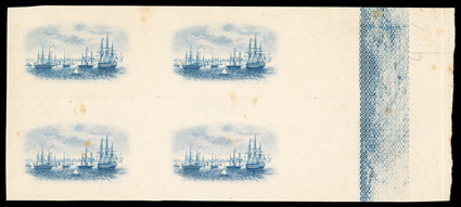 504 Ebl SG 98E ImageS.G. #98E, 1922 6d Vignette only plate proof in blue on thin card, wide right margin block of four, light horizontal crease between the vignettes and a few light stained spots, otherwise very fine; probably unique as a block of four (Scott #95E). (Image) Est. $500-750