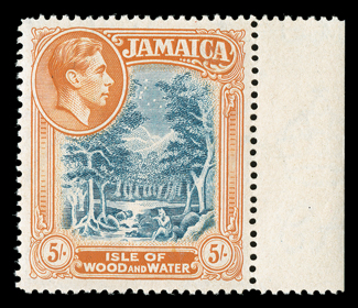 505 nh SG 132a ImageS.G. #132a, 1941 5/- Slate-blue and orange-yellow, line perforated 14, a desirable right sheet-margin single of this rare stamp, outstanding centering, bright colors, o.g., n.h., the accompanying certificate states "a little toned" which is incredibly harsh, as the front is absolutely pristine, while the gum is just slightly yellowish, there is no hint of toning whatsoever, extremely fine; 2011 BPA certificate (Scott #127 var.). (Image) £5,000