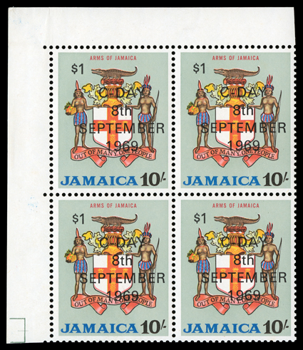 507 nhbl SG 291w ImageS.G. #291w, 1969 $1 on 10/- Decimal Currency surcharge, watermark inverted, top left corner margin mint block of four, o.g., n.h., very fine and scarce (Scott #290 var.). (Image) £520