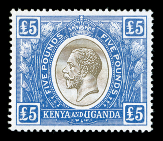 511 og 41 Image#41, 1922 £5 Blue and black, an exceptionally choice mint example of this scarce stamp, outstanding centering, intensely rich colors and sharp impression on immaculate white paper, o.g., lightly hinged, extremely fine (S.G. #99; £2,250). (Image) $2,400.00