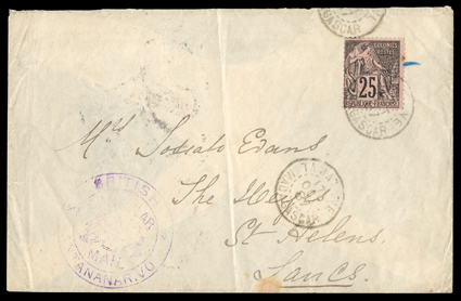 519 c   Image"BRITISH CONSULAR MAIL ANTANANARIVO" circular handstamp in violet, on 1887 cover from Madagascar to St. Helens, England, France 25c Black on red tied by Tamatave 17 Oct. 87 c.d.s., Paris and Liverpool transit backstamps, St. Helens receiver of Nov. 14, cover with light vertical filed fold not affecting stamp or markings, stamp with trivial toned spot, fine. (Image) Est. $150-200