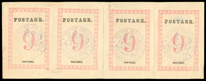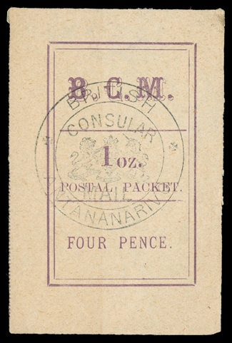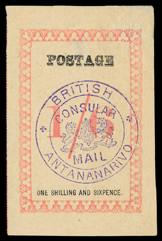 522 og 24 Image#24, 1886 9p Rose, Ty. I, "British Vice-Consulate" handstamp in violet, a very rare strip of four, which represents the complete sheet, completely intact, each stamp with o.g. in two corners, right stamp with a thin, a couple other tiny thin specks, small closed tear at top of third stamp, a few minor toned spots, overall of very fine appearance; any Madagascar Consular stamp in an intact strip of four is difficult to find, but to encounter one of the scarcer stamps such as this is nearly impossible, this particular sheet is believed to be unique (S.G. #20a; £5,200+). (Image) $4,000.00+