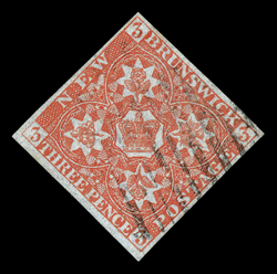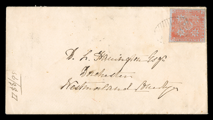 535 c 1 Image#1, 1851 3p Red, single with four large margins tied by light oval grid on 1860 cover from Fredericton to Dorchester, several backstamps, very fine stamp. (Image) $950.00