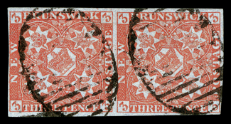 534 O 1 Image#1, 1851 3p Red, horizontal pair, mostly large margins around, a little close at left, brilliantly rich color and a sharp impression, very fine; 1998 Brandon certificate as S.G. #2 (Unitrade C$1,400.00+). (Image) $1,100.00+