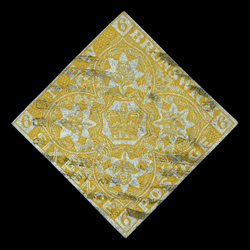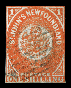 538 O 15 Image#15, 1860 1/- Orange, gorgeous rich color, margins all around that are close but clear, showing the entire frame lines on all four sides, light grid cancel, thin, fine appearance; a highly collectable example of this rare stamp; 1945 RPS certificate (Unitrade C$5,000.00). (Image) $11,500.00