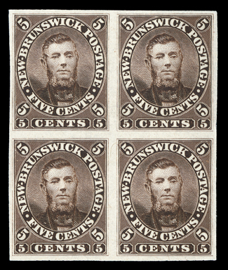 537 Pbl 5P ImageUnitrade #5P, 1860 5c Brown Connell, plate proof on India, block of four, large balanced margins all around, exceptionally fresh, extremely fine. (Image) C$1,200.00+