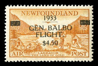 540 nh C18 Image#C18, 1933 $4.50 on 75c Balbo flight surcharge, attractive mint single, well centered amid large margins, vibrant color, o.g., never hinged, extremely fine (Unitrade C$800.00). (Image) $550.00