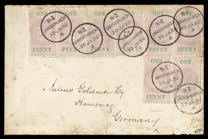 543 c Barefoot #180 ImageBarefoot #180, 1870 1p Lilac and green revenue, eight copies (two strips of three and one pair) tied by "Christchurch 30 Ja 86" c.d.s. postmarks on cover to Hamburg, Germany (Hamburg backstamp), cover with small edge faults and some mild toning affecting some stamp perf. tips, fine; fiscal stamps were never intended to be used for postal duty, but shortages of postage stamps led to their being tolerated for several years, this cover correctly pays the 8p pre-UPU rate; this is believed to be the largest franking of the One Cent revenue stamp on cover, as well as being one of the very few known examples to a foreign destination; 2002 Sismondo certificate. (Image) Est. $400-500