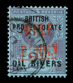 544 O 22 var. Image#22 var., 1893 "Half/Penn.y" Carmine surcharge on 2½p Violet on blue, used, fresh colors, c.d.s. cancel, very fine; 1980 BPA certificate (S.G. #17; £200). (Image) $200.00+