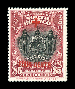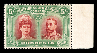 560 og S.G. #159 ImageS.G. #159, 1910 5/- Vermilion and deep green, right sheet-margin single, bright colors, o.g., lightly hinged, very fine (Scott #115 var.). (Image) £325