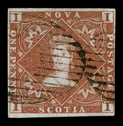 549 O 1 Image#1, 1853 1p Red brown, full margins except a little close at right, strong rich color, light grid cancels, very fine; 2001 Brandon certificate (Unitrade C$800.00). (Image) $650.00