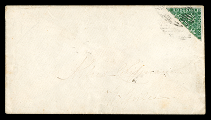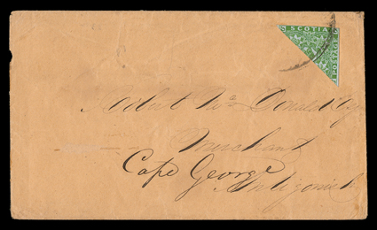 552 c 5a Image#5a, 1857 6p Dark green, half used as 3p, tied by grid cancels on 1860 cover, Wolfville, Bernick and Kentville backstamps, stamp with large margins and deep color, very fine; 2001 Brandon certificate (Unitrade C$7,000.00). (Image) $5,000.00