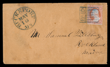41 c 11A Image#11A, 3c Dull red, Type II, single tied by fancy blue "Paid" in box of Bucksport, Me. (S-E #SD-G108) on cover to Rockland, blue Bucksport c.d.s., very fine strike; a rarely seen cancel; 2010 PF certificate. (Image) Est. $500-750