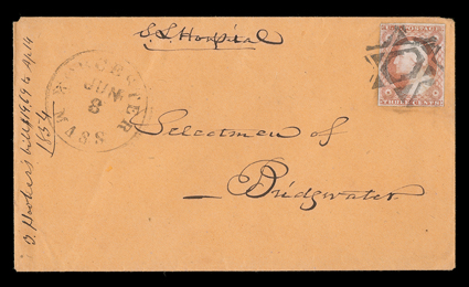 42 c 11A Image#11A, 3c Dull red, Type II, single tied by fancy Negative Six-Point Star of Worcester, Mass., addressed to "Selectmen of Bridgewater", Worcester c.d.s., 1854 docketing, very fine; 2011 PF certificate. (Image) Est. $300-400