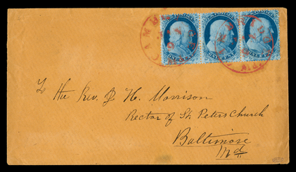 45 c 20 Image#20, 1c Blue, Ty. II, horizontal strip of three tied by bright red Cambridge, Md. c.d.s. postmarks on orange cover to Baltimore, stamps are positions 38-40L2, deep color, right stamp with faint toned spot, stamps with fine centering, overall a very fine and pretty cover; signed Ward and accompanied by a 2011 PF certificate. (Image) Est. $400-500