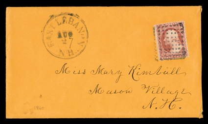 46 c 26 Image#26, 3c Dull red, Ty. II, well centered single tied by Square Patent grid of East Lebanon, N.H. on orange cover to Mason Village, with East Lebanon c.d.s. at left, opened at right, very fine; clear 2011 PF certificate. (Image) Est. $300-400