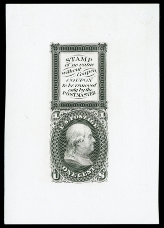 52 E 63-E13b Image#63-E13b, 1c Bowlsby patent coupon die essay in Black on white glazed paper, 53x76mm, marvelously fresh, with a sharp detailed impression on pristine white paper, faintest trace of a thin speck, very fine and rare; ex-Liberman. (Image) $1,750.00