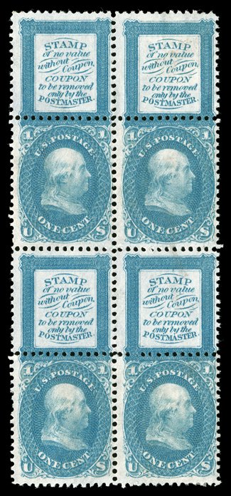 53 E 63-E13f Image#63-E13f, 1c Blue Bowlsby patent coupon, plate essay on white paper, perforated all around and between stamp and coupon, scarce block of four, fresh and intact, o.g., h.r.'s, fine-very fine and attractive; ex-Liberman. (Image) for singles $700.00
