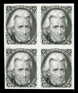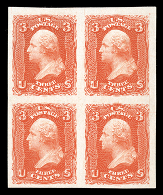 54 Pbl 63P3-78P3 Image#63P3-78P3, 1861-67 1c-90c plate proof on India cplt. in blocks of four, including #73P3, 74P3 and 77P3, each with large margins all around and bright fresh colors, a few minor natural India paper flaws, one 15c with small hole, otherwise a very fine and most attractive set of proof blocks; #74P3 accompanied by a 1990 PF certificate. (imagea) (Image) $4,275.00