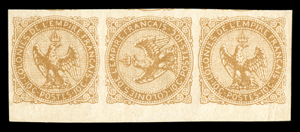 621 nh/og Yvert #3a ImageYvert #3a, 1859 10c Bister on yellowish, one sideways, incredibly fresh bottom sheet-margin mint strip of three, the center stamp sideways, large to very large margins, strong color on crisp clean paper, o.g., right stamp very lightly hinged and with a natural translucent spot, the left se-tenant pair never hinged, extremely fine; signed Pavoille (Scott #3a; $1,032.50 for hinged). (Image) for hinged €1,135