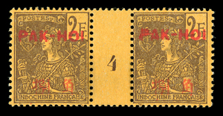 628 og Yvert #31 ImageYvert #31, 1906 "PAK-HOI" Bilingual overprint on 2Fr. Brown on orange, horizontal gutter pair with millesimes "4", strong and intact, o.g., l.h., fresh and fine-very fine; only 94 examples are possible (Scott #31 var.). (Image) Maury €1,000