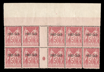 629 og/nhbl Yvert #14 ImageYvert #14, 1899 50c Rose, Type I, top margin millesime 0 block of ten, fresh color, o.g., never hinged except the middle stamp on the top row has album offset and a tiny thin speck, fine; a handsome and very rare millesime block; 2010 Scheller certificate (Scott #12a). (Image) Est. $1,000-1,500