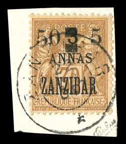 632 p Yvert #59 ImageYvert #59, 1904 "50" and "5" Surcharge on 3a on 30c Brown on bister, used as are all known examples, tied to piece by neat 22 July 1904 postmark, very fine and rare, only 100 stamps were surcharged; signed Calves and Roumet (Scott #51; $1,200.00). (Image) €1,400