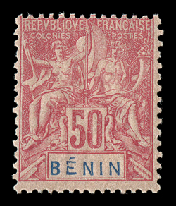 636 og Yvert #12 var. ImageYvert #12 var., 1892 "BENIN" Overprint on 75c Carmine on rose, omitted "B" of "BENIN" on overprint with accent over the "E", bright and fresh, o.g., minor h.r., fine; signed Behr and Calves (Scott #12 var; $500.00 for normal). (Image) for normal €475