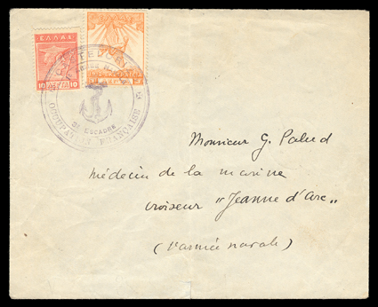 638 c   Image"Castelorizo/Occupation Francaise/1e Armee Navale/3e Escadre" and anchor cachet tying Greece 1911 10l Carmine rose and 1912 3l Orange (Scott #202, N153) to cover addressed to a medic on board the cruiser Jeanne D'Arc, "Corr. D'Armees/Port-Said/16 FEVR, 16" backstamp, cover with harmless vertical pocket fold, very fine and scarce. (Image) Maury €1,150