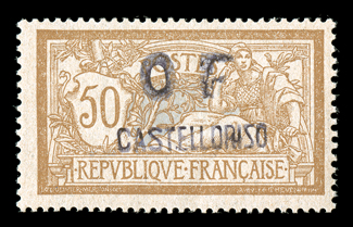 639 og Yvert #41 ImageYvert #41, 1920 "O F/CASTELLORISO" Handstamped overprint on 50c Bister brown and lavender nicely centered and quite fresh, o.g., very fine and scarce; signed Calves (Scott #37; $1,000.00). (Image) €1,050