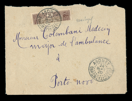 640 c Yvert #55 var. ImageYvert #55 var., 1913 50c Chocolate and brown, bisect, the right vertical half tied to cover to Porto Novo by clear "Abomey, Dahomey et Depses/24 Sept, 20" postmark across the cut, datestamp repeated at bottom right, Porto Novo backstamp, cover roughly opened at top and a portion of the back missing at top, very fine usage (Scott #64a). (Image) Scott $500.00
