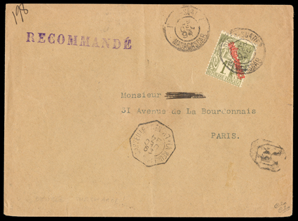 643 c Yvert #24a ImageYvert #24a, 1892 "DIEGO-SUAREZ" Overprint on 1Fr. Bronze green on straw, double overprint, tied to registered cover to Paris by "Diego-Suarez, Madagascar/28 Dec 94" c.d.s. which is repeated alongside, octangular "La Reunion a Marseille" transit and Paris arrival backstamp, very fine and rare on cover usage; signed Calves twice (Scott #24a). (Image) Est. $150-200