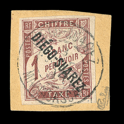 644 p Yvert #TT13 ImageYvert #TT13, 1892 "DIEGO-SUAREZ" Overprint on 1Fr. Brown, tied to small piece by neat 1892 Diego-Suarez postmark, large margins all around, extremely fine and scarce; only 150 stamps were overprinted; signed Calves (Scott #J13; $1,500.00). (Image) €1,650