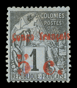 645 og Yvert #1A ImageYvert #1A, 1891 Red "Congo francais/5 C." Surcharge on 1c Black on lavender, a pleasing mint example of this rarity, rich fresh color and bold surcharge impression, o.g., a fine example of this challenging and elusive issue; only 100 stamps were surcharged in red, many of which were used; signed Bernichon and Calves and accompanied by 2000 Behr certificate (Scott #1; $6,250.00). (Image) €8,000