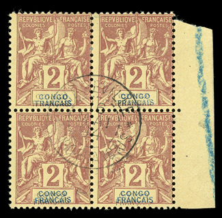 647 Obl Yvert #13a ImageYvert #13a, 1892 2c Brown on bluff, double inscription in black and blue, right sheet-margin used block of four, light central 16 May 1894 Libreville c.d.s., fine; signed A. Brun twice and Kohler twice (Scott #19a; $700.00 for singles). (Image) for singles €800
