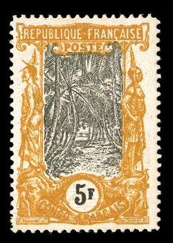 649 og Yvert #41a ImageYvert #41a, 1900 5Fr. Ocher and grey, well centered for this, rich distinctive color on fresh paper, o.g., h.r., very fine; only a single sheet of 50 of this color error was printed; signed Bloch and A. Brun (Scott #49a; $750.00). (Image) €1,000