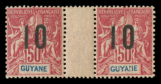 646 O Yvert #6a ImageYvert #6a, 1891-92 "COngo Francais/10 C." Surcharge on 40c Red on straw, double surcharge, attractive example of this rare error which is only known used, cancelled by a socked-on-the-nose 8 June 1892 Libreville c.d.s., well centered, strong color on fresh white paper, single nibbed perf. at left, otherwise very fine; signed A. Brun and Roumet and accompanied by 2010 Roumet certificate (Scott #9 var.). (Image) €2,650