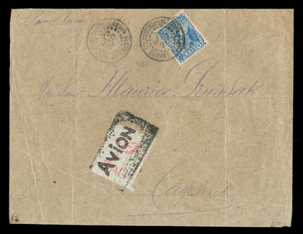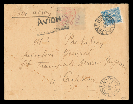 654 c Yvert #PA1 ImageYvert #PA1, 1921 75c Red violet on orange brown, pin perforated, and overprinted with a portion of the red violet double oval company cachet as always, tied by "Avion" woodblock company cancel to cover to Cayenne, additionally franked with 1905 25c Blue (#56) tied by bold "St. LAURENT DU MARONI, GUYANE FRANse/21 JUIL, 21" datestamp, postmark repeated at bottom right, "por avion" directive and backstamped at Cayenne the next day, trivial opening tear at top left, very fine and rare; only 120 stamps were printed and very few on cover examples have survived; signed Calves and accompanied by his 1993 certificate (Scott #CL2; $5,000.00). (Image) Maury €6,000