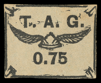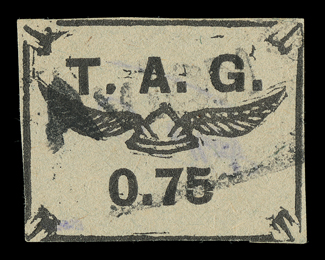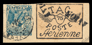 657 O Yvert #PA4 ImageYvert #PA4, 1921 75c Black on bluish, used with "AVION" woodblock company cancel, ample to mostly large margins all around, strong impression on fresh paper, very fine and choice; only 500 stamps were printed; signed Rendon and by Octave Bellevue, an official with Comptoirs Hesse et Cie of Cayenne (Scott #CL4; $800.00). (Image) €900