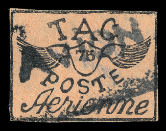 659 O Yvert #PA8 ImageYvert #PA8, 1921 75c Black on salmon, used with "Avion" woodcut company handstamp, margins clear to touching, fine and scarce; signed Calves and by Octave Bellevue, an official with Comptoirs Hesse et Cie of Cayenne (Scott #CL12; $1,200.00). (Image) €1,400