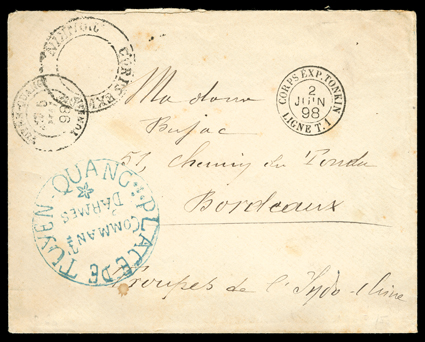 702 c   ImagePlace de Tuyen-Quang/CommanT/D'Armes, large blue military cachet and dateless double circle "Corps Exped Tonkin" postmark on cover to Bordeaux, "Tuyen Quang/5 Mai, 98" and bold "Corps Exp Tonking/Ligne T. 1/2 Juin, 98" transit postmarks, Tonking departure and Bordeaux arrival backstamps, very fine and scarce soldier's letter. (Image) Est. $150-200