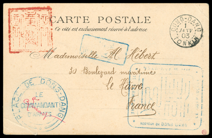 703 c   ImagePlace de Dong-Dang/Le/Commandant/D'Armes, large blue military cachet signed by an officer and three other military chops on picture post card to Le Havre, "Dong-Dang, Tonkin/1 Janv, 03" datestamp, card with tape repaired corner crease at bottom left, otherwise very fine and rare. (Image) Est. $200-300
