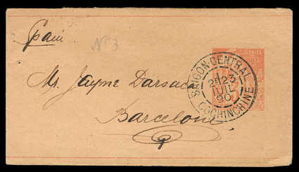 704 c   ImageFrench Colonies 3c Red wrapper to Spain, used with clear "Saigon Central, Cochinchine/23 Juil, 90" datestamp, mounting adhesion on reverse, very fine; a very scarce foreign rate. (Image) Est. $100-150